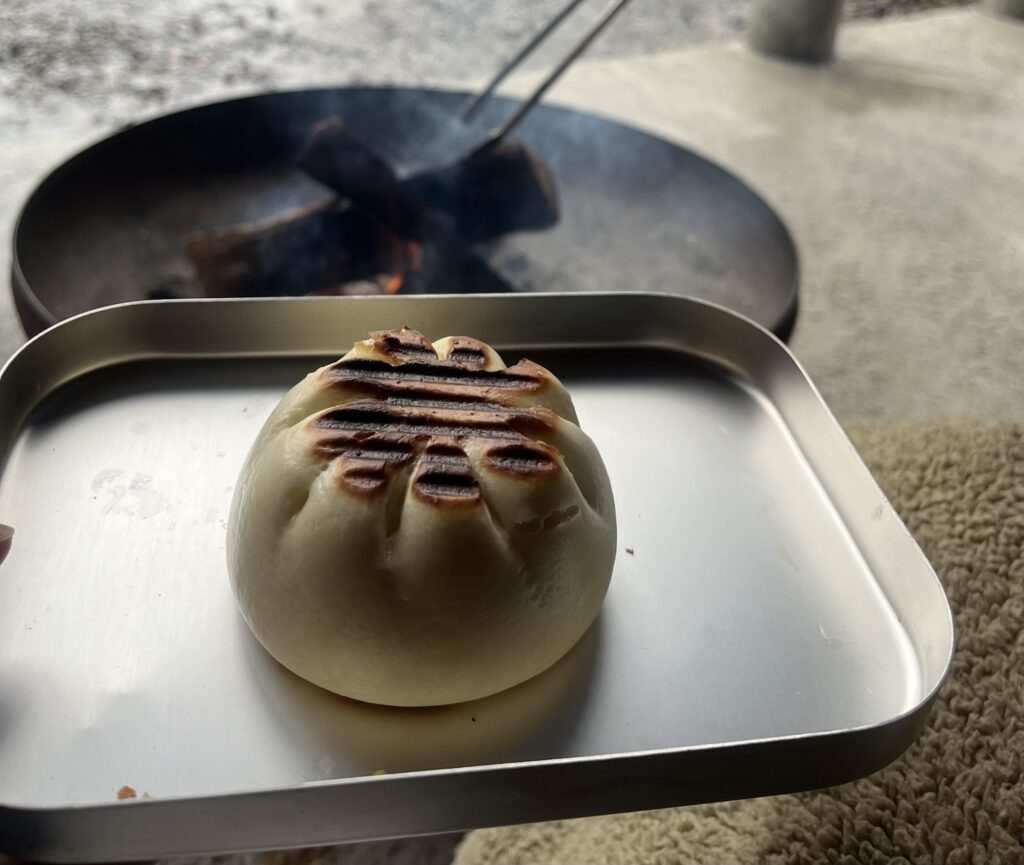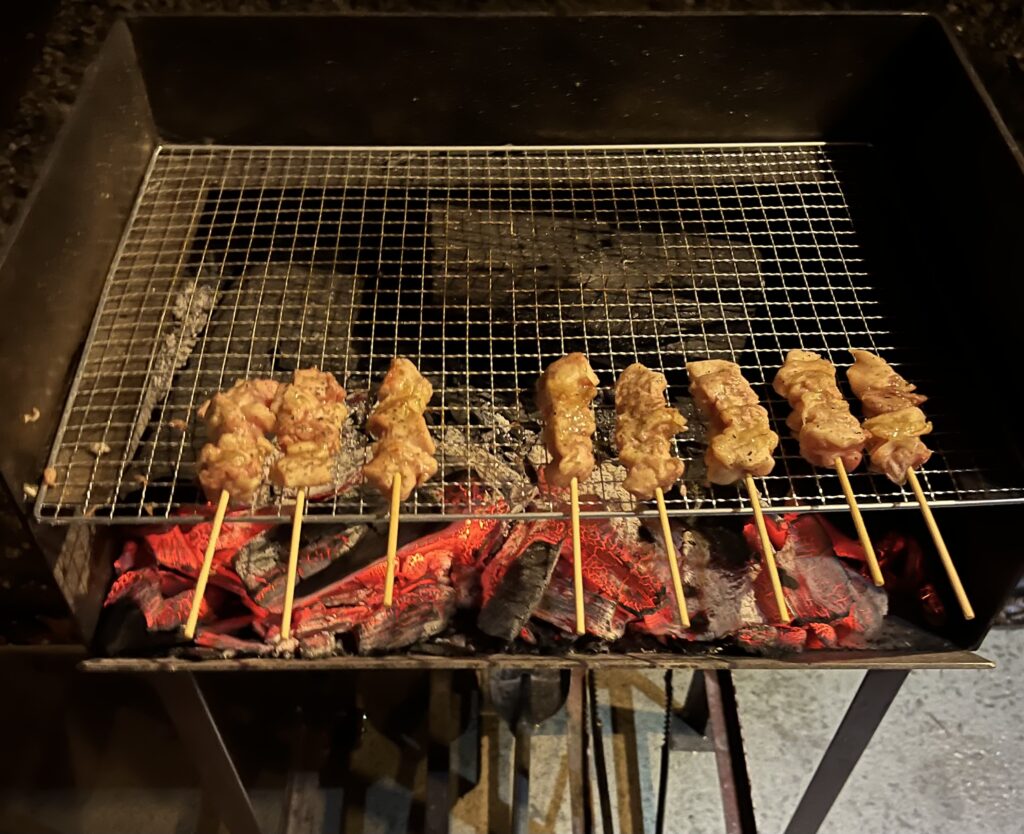 さらに、娘が「何かもっと食べたい!」と言うので、管理棟で売っていた焼き鳥を買って、炭火で焼いて食べました!ほかにも、キッチンカーやラーメンのお店も出ていて、キャンプ場グルメが充実しているのは子連れには本当にありがたいポイントです。