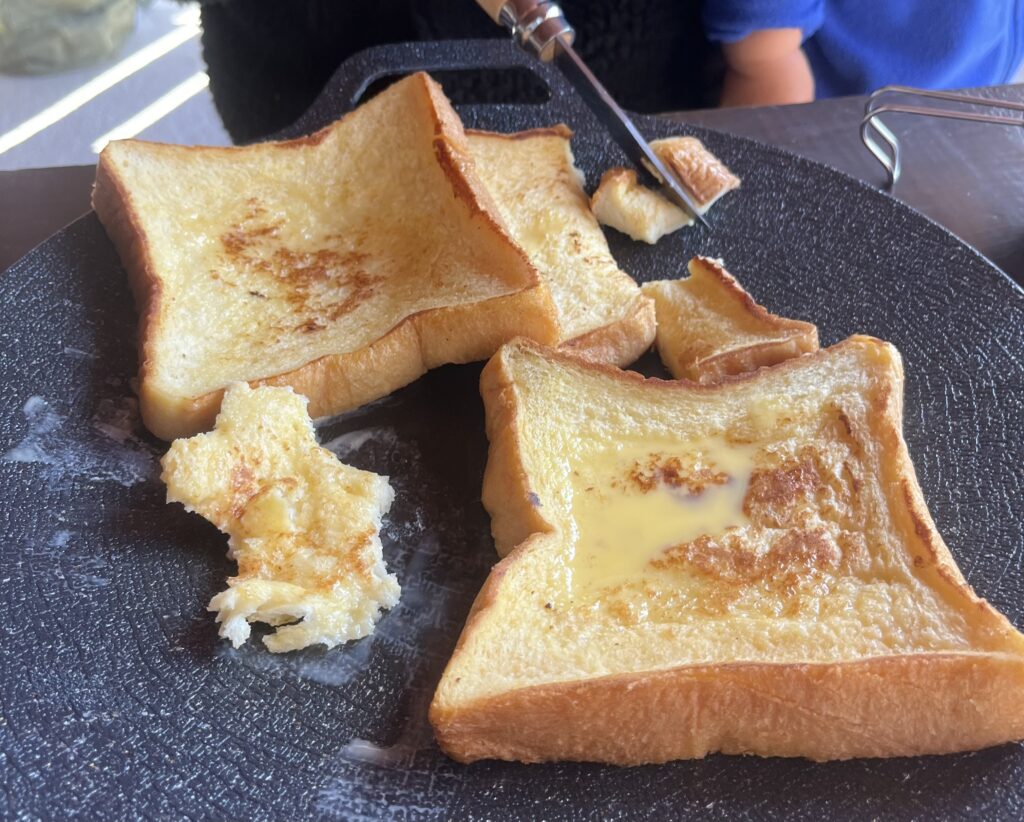 最終日の朝食には、キャンプアンドキャビンズ山中湖の名物「100円フレンチトースト」をいただきました。とろっとしたバターシロップと、あたたかいスープやコーヒーがついていて朝からほっこり。