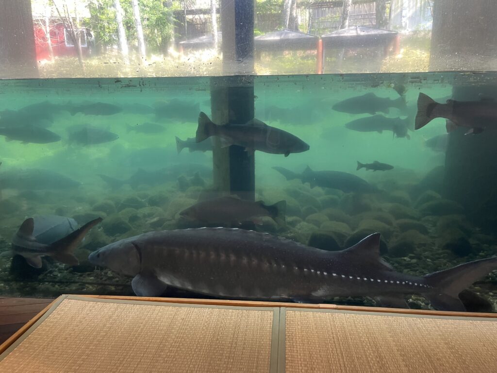 山中湖エリアで立ち寄れる、小さめながら充実した淡水魚メインの水族館。大水槽では魚が間近で見られます。