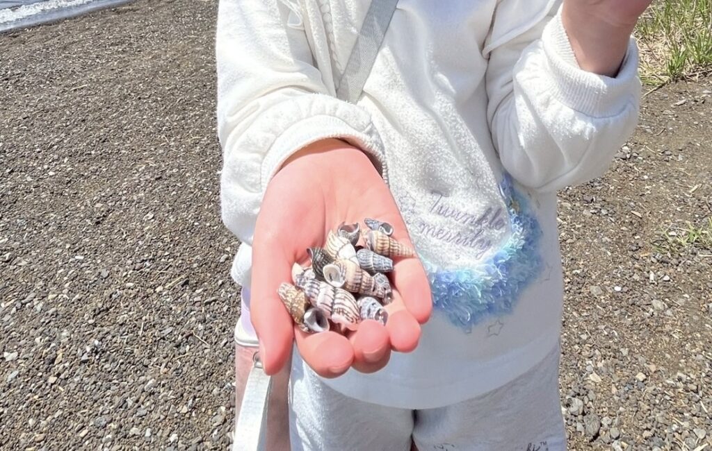 小学生の娘は貝殻拾いや水遊びに夢中、1歳の息子は自由に歩き回ったりおやつを食べたり…家族みんなでのびのび過ごせました。