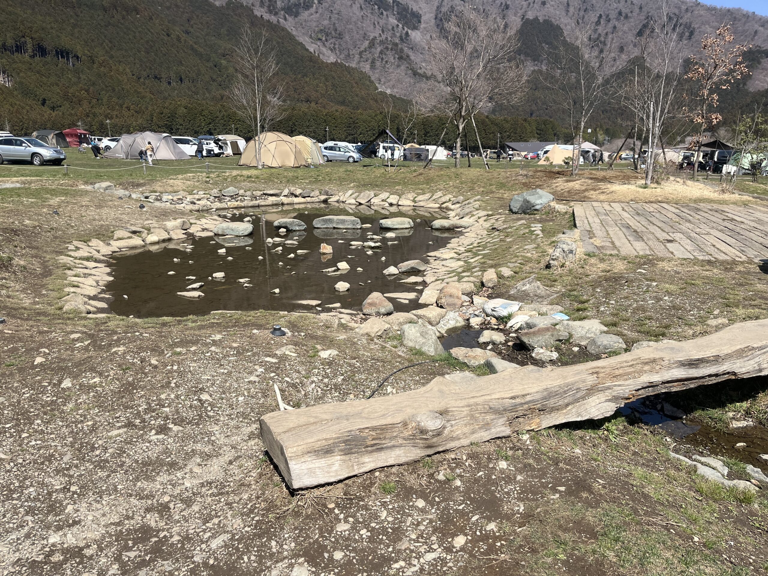 設営後、娘はさっそく探検へ。すぐにじゃぶじゃぶ池を発見しました。靴を脱いで足を入れて大はしゃぎ。GWはこの池におたまじゃくしがたくさんいたので、子どもたちはみんな夢中でおたまじゃくし探しを楽しんでいました。