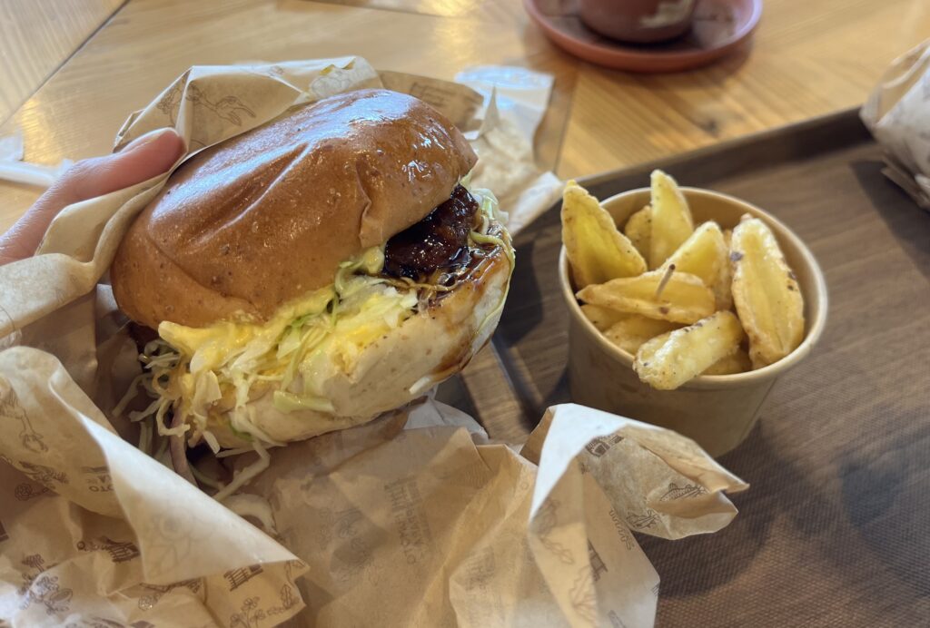 今回のキャンプとは別の日に訪れた際、ふもとっぱらにある「金山テラス」というお店を利用しました。大きな窓から富士山を眺めながら、ハンバーガーやラーメンなどの食事が楽しめます。
