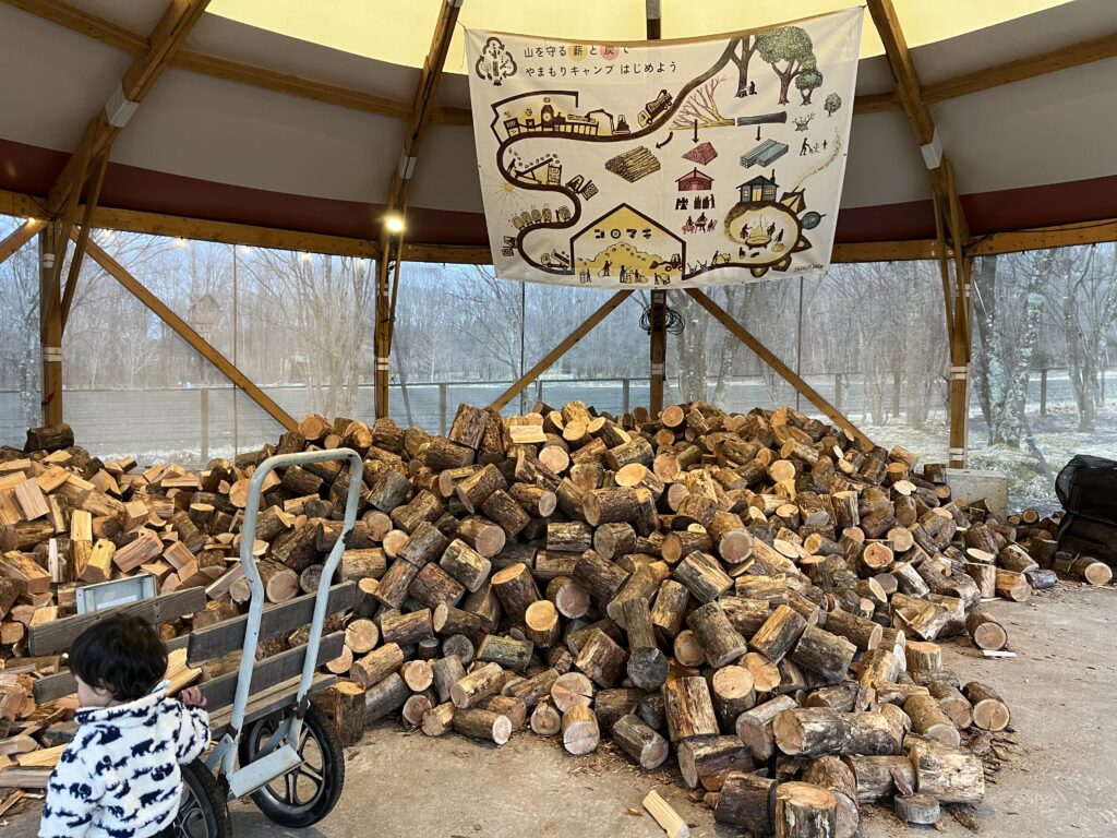 たくさん遊んだあとは薪ストーブの準備へ。「コロ薪ステーション」から薪を運びます。