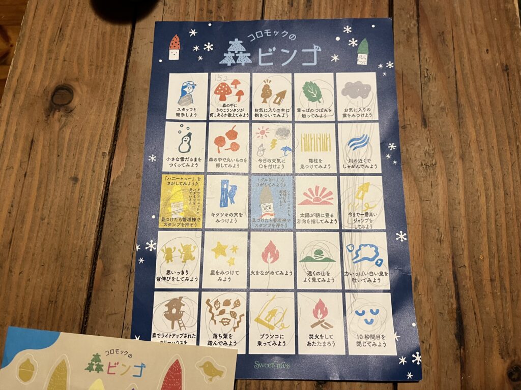 午後は管理棟で「森のビンゴ」を購入し、それを持っておじぎっぱの森探検へ出発!娘は楽しそうにビンゴをチェックしながら歩いていました。ただ、内容は未就学児向けの簡単なもので、景品はシールでした。