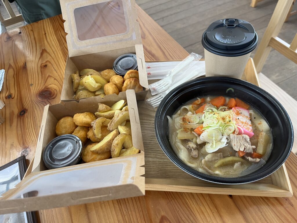 この日はランチメニューの「豚汁おきりこみうどん」を注文。寒い冬キャンプのあとに食べる温かいうどんはとても美味しくておすすめです。